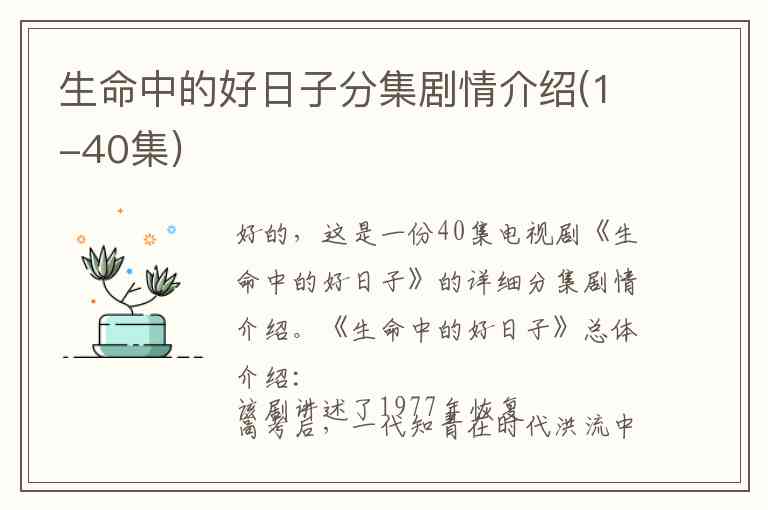 好的,这是一份40集电视剧《生命中的好日子》的详细分集剧情介绍。