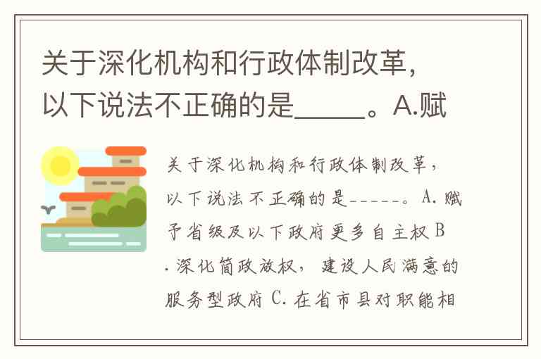 关于深化机构和行政体制改革,以下说法不正确的是_____。A.赋予省级及以下政府更多自主权 B.深化简政放权,建设人民满意的服务型政府 C.在省市县对职能相近的党政机关全面实行合署办公 D.统筹考虑各类机构设置,科学配置党政部门及内设机构权力