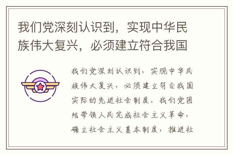 我们党深刻认识到,实现中华民族伟大复兴,必须建立符合我国实际的先进社会制度。我们党团结带领人民完成社会主义革命,确立社会主义基本制度,推进社会主义建设,完成了中华民族有史以来最为广泛而深刻的社会变革,为当代中国一切发展进步奠定了根本政治前提和制度基础,实现了中华民族由近代不断衰落到根本扭转命运、持续走向繁荣富强的伟大飞跃。( )