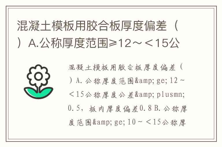 混凝土模板用胶合板厚度偏差()A.公称厚度范围≥12~<15公称厚度公差±0.5,板内厚度偏差0.8 B.公称厚度范围≥10~<15公称厚度公差±0.5,板内厚度偏差0.8 C.公称厚度范围≥12~<15公称厚度公差±0.5,板内厚度偏差0.9 D.公称厚度范围≥10~<15公称厚度公差±0.5,板内厚度偏差0.9