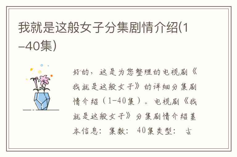 好的,这是为您整理的电视剧《我就是这般女子》的详细分集剧情介绍(1-40集)。