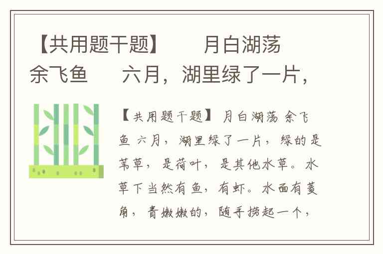 【共用题干题】 月白湖荡 余飞鱼 六月,湖里绿了一片,绿的是苇草,是荷叶,是其他水草。水草下当然有鱼,有虾。水面有菱角,青嫩嫩的,随手捞起一个,洗一洗就可以生吃,味道青鲜鲜的。水下呢,还有嫩嫩的藕。 棒子捞了几个菱角,还有几个嫩藕,不是自己吃,是给小王叔叔的。每次等待小王叔叔时,棒子都会这么做。等到芦苇那边传来两声鸟鸣,小王叔叔就会出现,来时,骑着匹大白马。小王叔叔吃着菱角,还有嫩藕。棒子就跑过去,羡慕地摸着大白马的鬃毛。 小王叔叔笑道,“想骑?”棒子点点头,“当然。” 小王叔叔就老气横秋地说:“小鬼,太矮了,脑袋高过马背时,才能骑。”棒子噘着嘴,暗地里和白马比比,头刚刚挨着马背。他想,再过一年就高过马背了,就可以了。 可是,离开后,小王叔叔却再没有来过,他牺牲了。那天,棒子撑着一只小划子,藏在苇草里,等着小王叔叔送信来,没有等到,几声鸟鸣后,他等来的是一个陌生人,是张叔叔。 棒子忙问:“小王叔叔呢?”张叔叔红了眼圈,轻声告诉他,小王叔叔遭遇了小鬼子,牺牲了。棒子眼睛顿时模糊了,他喃喃地道:“怎么会?小王叔叔有大白马,又高又大,跑起来飞快。” 张叔叔叹息,小鬼子的东洋马比新四军的马更高更大,跑起来比小王叔叔的大白马快多了。棒子咬着牙,狠狠地道:“东洋马,真可恨!”张叔叔也点点头咬着牙说:“我们要报仇。” 报仇的机会就在眼前。原来,张叔叔这次来,是传达上级命令的。最近,一支新四军骑兵营要经过这儿,准备和湖东新四军二团会合,端掉小鬼子的碉堡。张叔叔告诉棒子,骑兵营来时,希望棒子能给带路。棒子高兴极了,说声是。 骑兵营来时是在一个晚上。张叔叔带头,将骑兵营营长介绍给棒子。棒子很高兴,看看这匹骏马,又摸摸那匹。骑兵营营长开玩笑说,没骑过吧?棒子使劲地点头,傻乎乎的样子。逗得骑兵营营长笑了,张叔叔也笑了。 湖里芦苇丛中隐藏着一条暗道,在湖中间,有新四军的监察哨把守着。棒子当然能带人顺利通过,因为棒子是新四军的通信员啊。他手一挥,带着骑兵营出发了。 已经是后半夜了,湖上月光变得更亮更白。苇草深处,不时传来露珠滴落声,还有“咚”的一响,是青蛙跳水的声音。棒子带着部队,静静地走着,沿着那条路走着,新四军监察哨看见了,没有阻拦。棒子带着骑兵营走到一处湖湾处,将两根手指插入嘴里,“嘘”地吹响一声口哨。在其他人还没反应过来时,他已抱着身边的张叔叔,“扑通”跳入湖水深处的苇草丛里。 湖里的月光顿时碎了。 枪声响起,打破湖面的寂静。骑兵营士兵一个个在枪声中倒下,不一会儿,全被消灭。随着战斗的结束,棒子浮出水面,拖着肚子已经灌满水的张叔叔。 张叔叔不是什么通信员,是日军间谍大木三郎。 大木三郎一直想破获新四军的交通线,就悄悄盯上了小王叔叔,枪杀了小王叔叔。然后,自己扮成通信员,哄骗棒子,准备带着日军特种部队,假扮作新四军骑兵营,将湖东新四军一举歼灭。 他最终自投罗网,却弄不清自己究竟在哪儿露了马脚。 棒子得意地说,是你自己吐露了真相的。 棒子说,大木三郎曾告诉自己,东洋马比小王叔叔的大白马高大。当骑兵营出现时,自己走过去,站在马旁暗暗一比,那些马都高过了自己的脑袋,而大白马和自己脑袋齐平。他终于清楚,他遭遇了日军。因此,发出鸟鸣,让提前防备着的新四军出击。 大木三郎一听,傻了眼。 棒子随着新四军战士押着垂头丧气的大木三郎,迅速消失在月光下的苇丛中。月光慢慢变淡了,照着湖面,苇丛里有只小划子,如一牙月亮,一晃一晃的。 (选自《2017年中国年度微型小说》有删改) 按时间顺序,把小说《月白湖荡》的情节归纳完整。(不超过50字) ①棒子得知通信员小王叔叔被小鬼子杀害,下决心为他报仇。 ②新来的通信员张叔叔告诉棒子,新四军骑兵营准备和湖东二团会合,端掉鬼子碉堡,希望棒子带路,棒子同意。 ③()