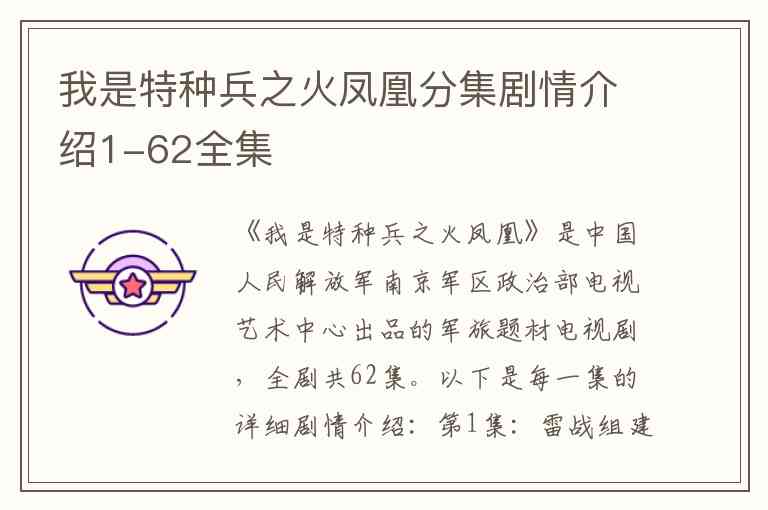 《我是特种兵之火凤凰》是中国人民解放军南京军区政治部电视艺术中心出品的军旅题材电视剧,全剧共62集。以下是每一集的详细剧情介绍: