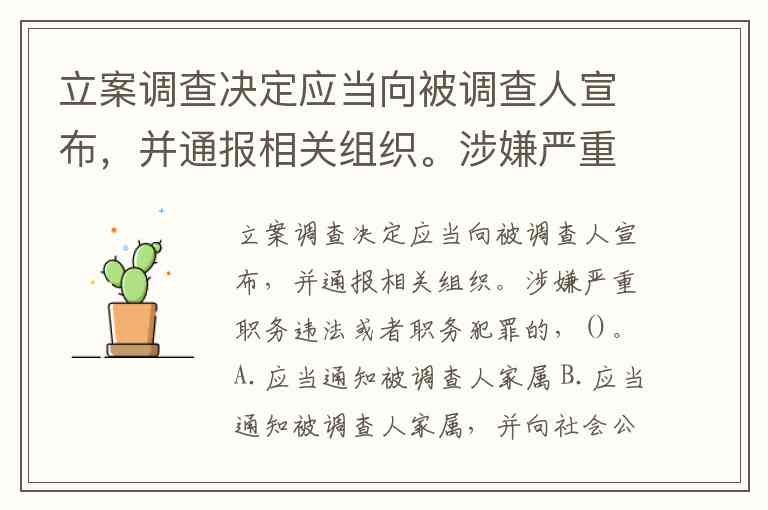 立案调查决定应当向被调查人宣布,并通报相关组织。涉嫌严重职务违法或者职务犯罪的,()。A.应当通知被调查人家属 B.应当通知被调查人家属,并向社会公开发布 C.应当通知被调查人家属,酌情向社会公开发布 D.不用通知被调查人家属