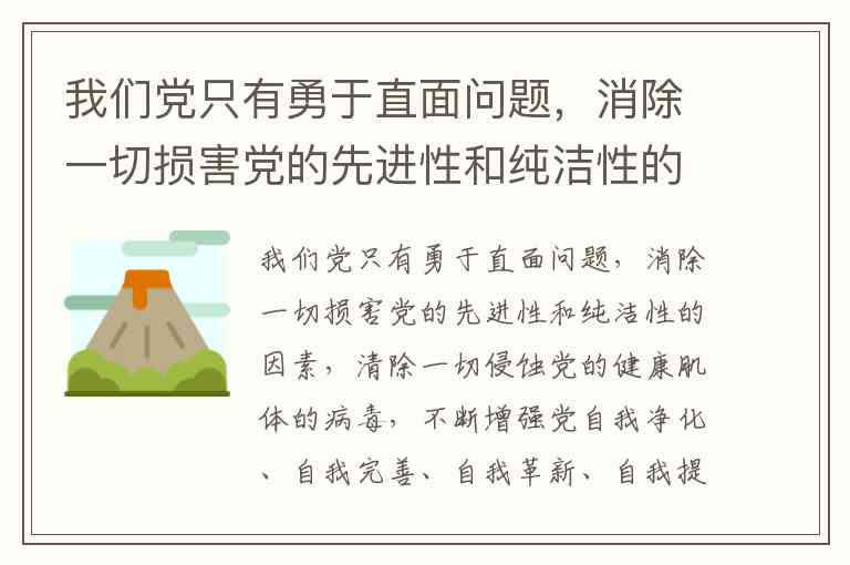 这句话深刻阐明了中国共产党保持先进性和纯洁性的必然要求。直面问题是勇气,清除病毒是手段,"四个自我"能力是核心,最终目标是确保党始终成为中国特色社会主义事业的坚强领导核心。这一论述体现了我们党对执政规律的深刻把握,彰显了刀刃向内的自我革命精神——唯有不断净化思想、完善制度、革新理念、提高本领,才能在长期执政条件下永葆生机活力,带领中国人民在民族复兴道路上行稳致远。
