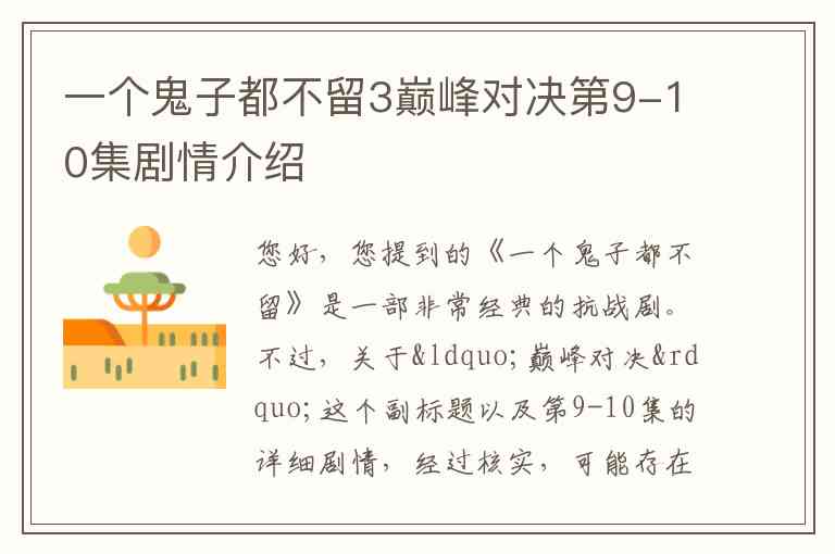 您好,您提到的《一个鬼子都不留》是一部非常经典的抗战剧。不过,关于“巅峰对决”这个副标题以及第9-10集的详细剧情,经过核实,可能存在一些信息混淆。