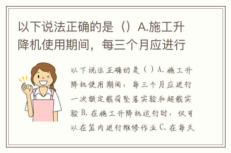 以下说法正确的是()A.施工升降机使用期间,每三个月应进行一次额定载荷坠落实验和超载实验 B.在施工升降机运行时,仅可以在笼内进行维修作业 C.在每天开工前和每次换班前,司机应检查限位开关 D.在使用期间每个季度使用单位应组织专业技术人员对施工升降机进行检查 E.施工升降机检修时必须切断电源