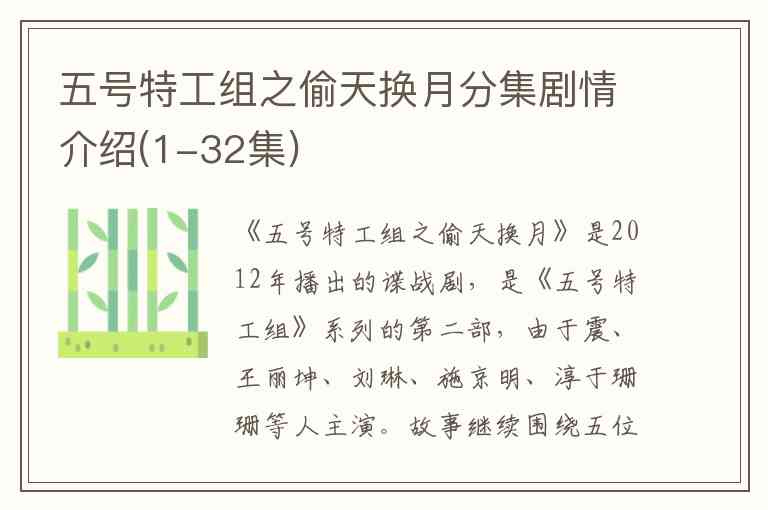 《五号特工组之偷天换月》是2012年播出的谍战剧,是《五号特工组》系列的第二部,由于震、王丽坤、刘琳、施京明、淳于珊珊等人主演。故事继续围绕五位身怀绝技的特工——马云飞、高寒、何坚、李智博和欧阳剑平,在抗日战争背景下,与日本间谍组织展开殊死搏斗。