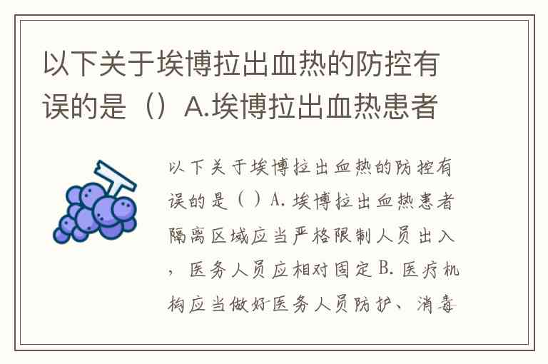 以下关于埃博拉出血热的防控有误的是()A.埃博拉出血热患者隔离区域应当严格限制人员出入,医务人员应相对固定 B.医疗机构应当做好医务人员防护、消毒等措施所需物资的储备,防护用品及相关物资应符合国家有关要求 C.医疗机构应当严格遵循《医疗机构消毒技术规范》(WS/T367-2012)的要求,做好诊疗器械、物体表面、地面等的清洁与消毒 D.埃博拉出血热留观病区和定点收治病区应当建立严格的探视制度,设立陪护
