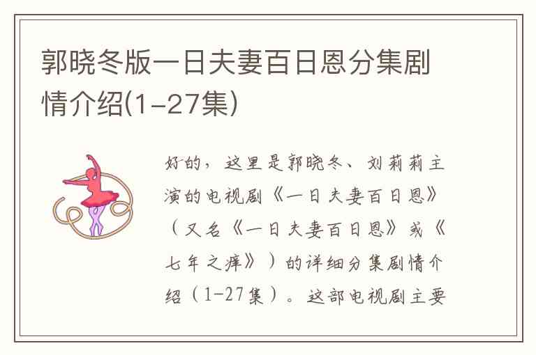 好的,这里是郭晓冬、刘莉莉主演的电视剧《一日夫妻百日恩》(又名《一日夫妻百日恩》或《七年之痒》)的详细分集剧情介绍(1-27集)。
