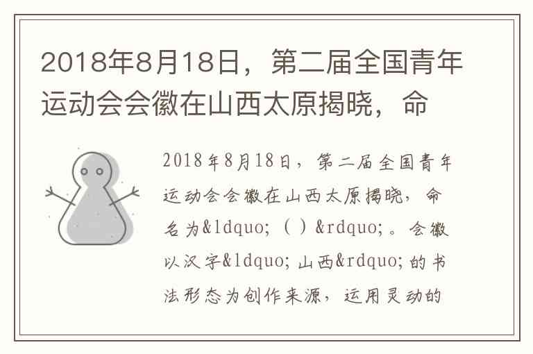 2018年8月18日,第二届全国青年运动会会徽在山西太原揭晓,命名为“()”。会徽以汉字“山西”的书法形态为创作来源,运用灵动的线条,将跑道与泳道的形象特点与汉字融为一体,表达了运动拼搏的内涵,呈现出青春现代、充满活力的形象。A.山江 B.山河 C.山湖 D.上海