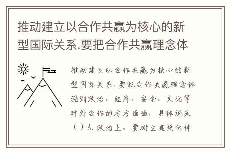 推动建立以合作共赢为核心的新型国际关系.要把合作共赢理念体现到政治、经济、安全、文化等对外合作的方方面面,具体说来()A.政治上,要树立建设伙伴关系的新思路 B.经济上,要开创共同发展的新前景 C.安全上,要营造各国共享安全的新局面 D.文化上,要形成不同文明包容互鉴的新气象