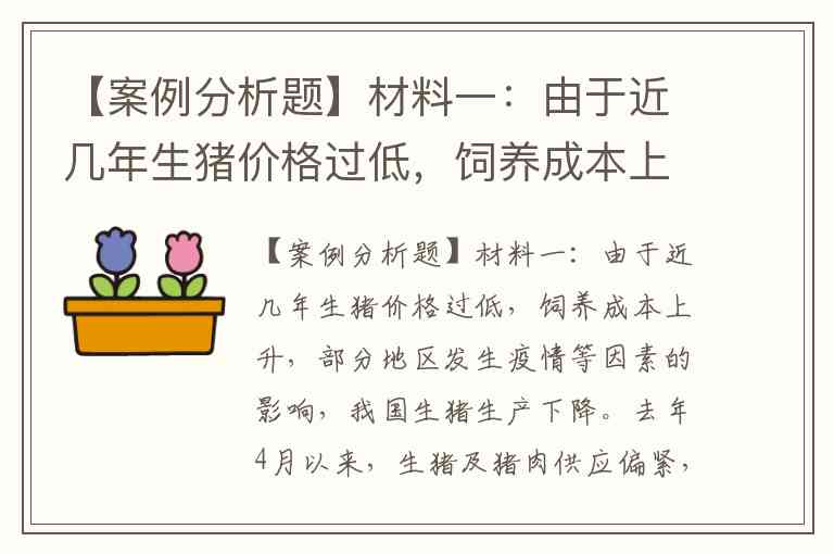 【案例分析题】材料一:由于近几年生猪价格过低,饲养成本上升,部分地区发生疫情等因素的影响,我国生猪生产下降。去年4月以来,生猪及猪肉供应偏紧,价格出现较大幅度上涨。猪肉价格一涨,苦了居民,喜了农民。农民有了更多的收获,当然高兴。但城市居民的生活受到影响,富了的城市人毕竟是少数,大多数城市居民还是中低收入者,面对十几元一斤的猪肉实在尴尬。 材料二:从2011年12月以来,居民消费物价指数(CPI)的涨幅有明显增加的趋势。去年一季度CPI是2.7%,二季度到了3.6%,如果从单月来看,六月份到达4.4%,七月份到达了5.6%。通过认真分析发现,物价上涨主要是由食品类价格上涨引起的。 结合上述材料,回答下列问题:猪肉价格上涨体现了经济生活的哪些道理?