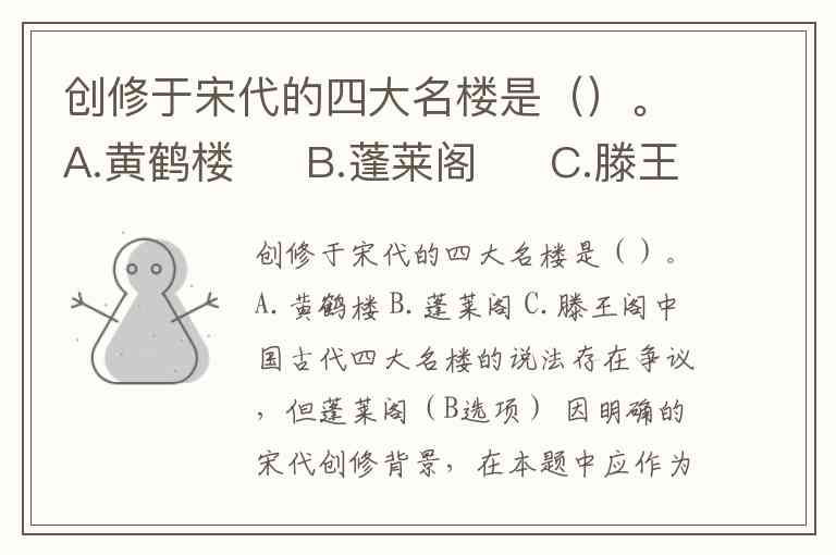中国古代四大名楼的说法存在争议,但蓬莱阁(B选项) 因明确的宋代创修背景,在本题中应作为正确答案。滕王阁(C选项)始建于唐代,黄鹤楼(A选项)源于三国时期,二者虽为“江南三大名楼”核心成员,却非宋代始建。