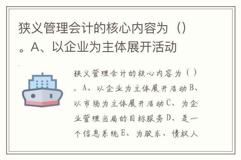 狭义管理会计的核心内容为()。A、以企业为主体展开活动 B、以市场为主体展开活动 C、为企业管理当局的目标服务 D、是一个信息系统 E、为股东、债权人、制度制定机构及税务等非管理机构服务 F、内容上,既包括财务会计,又包括成本会计和财务管理