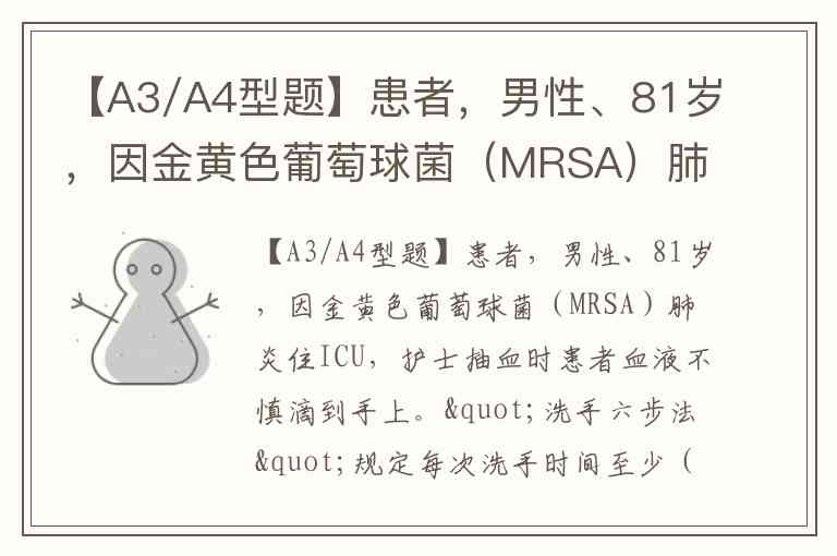 【A3/A4型题】患者,男性、81岁,因金黄色葡萄球菌(MRSA)肺炎住ICU,护士抽血时患者血液不慎滴到手上。"洗手六步法"规定每次洗手时间至少()A.5~10秒 B.15~20秒 C.25~30秒 D.35~40秒 E.45~50秒
