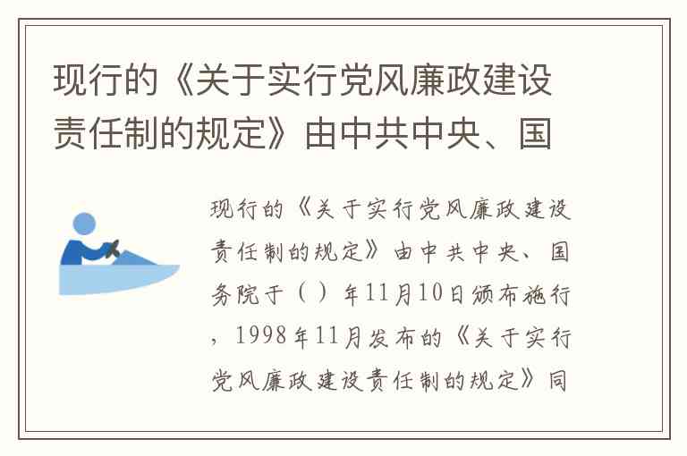 现行的《关于实行党风廉政建设责任制的规定》由中共中央、国务院于2010年11月10日颁布施行,1998年11月发布的同名规定同时废止。这一修订是党风廉政建设制度体系完善的重要举措,旨在适应新形势下反腐倡廉工作的需要,强化领导班子和领导干部的政治责任。