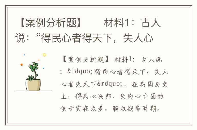 【案例分析题】 材料1:古人说:“得民心者得天下,失人心者失天下”。在我国历史上,得民心兴邦、失民心亡国的例子实在太多。解放战争时期,蒋介石有800万军队,有美式先进装备,但由于丧失人心,结果败在小米加步枪的l20万人民解放军手下。抗战时期,美国作家斯诺在延安看到毛泽东住窑洞,周恩来睡土炕等小事,洞察出中国共产党的巨大力量,并动情地称之为“东方魔力”、“兴国之光”。爱国华侨陈嘉庚抗战时在重庆,蒋介石用800元大洋请他吃山珍海味;而到了延安,毛泽东用自己种的菜和房东送的一只鸡招待陈嘉庚。强烈的对比后,陈含着眼泪说:共产党一定能胜利。这些有识之士正是透过党的作风,看到了共产党的崇高精神和巨大力量。 材料2:在决定政权存亡的诸多因素中,最重要的就是人心。中国共产党由革命党发展成为执政党的根本成功之处,就是取得了亿万民众的理解和支持,最终赢得了人心。人民通过大量活脱脱的事实了解并认识了共产党,概括起来讲,在以下的历史进程中,我们党赢得了民心:共产党人的牺牲和奉献精神赢得了民心,1921年到l937年,牺牲和失踪的共产党员有40万左右,解放前夕,仅有名可查的共产党员烈士达370万人;进入社会主义建设时期,劳动模范中75%是共产党员,先进工作者中85%是共产党员。建国初期,毛泽东明确指出:凡是一切权力机构名称前都要冠以“人民”两字。这样,除人民共和国外,还有人民代表大会、人民政府、人民政协、人民军队、人民检察院、人民法院、人民警察及人民银行、人民保险等,我们党把人民的意志、人民的利益渗透到社会各个领域。纠正自身的失误和错误赢得了民心,面对失误和错误,党历来是实事求是,有错必改、有错必纠。纠正“文革”的错误,就焕发了亿万人民的积极性。为人民谋利赢得了民心,人民从党领导的事业中,从政治、经济、文化建设中获得看得见、摸得着的利益。 材料3:当前,我党在作风建设中也确实出现了许多值得严重注意的问题。例如,在思想作风上,有的僵化保守,唯书唯上,把“解放思想、实事求是”只是当口号喊,并不在行动上真正落实;在学风上,有的只记马克思主义理论的词句,不在掌握革命理论的基本原理和立场观点方法上下功夫,甚至对科学理论采取实用主义态度,寻章摘句,为我所用,说的是一套,做的是另一套;在工作作风上,有的惯于搞形式主义、官僚主义,表面上“政绩显赫”,实际上劳民伤财,群众怨声载道;在领导作风上,有的违背民主集中制原则,搞“家长制”、“一言堂”,或者奉行好人主义、自由主义;在干部生活作风上,有的把艰苦奋斗、艰苦创业的精神丢到脑后,贪图安逸、追求享受,以权谋私,腐化堕落,等等。这些不良作风给党抹了黑,与“三个代表’’的要求背道而驰,实际上把党推到了十分危险的境地。 材料4:江泽民同志指出:“历史和现实都表明,一个政权也好,一个政党也好,其前途与命运最终取决于人心的向背,不能赢得最广大群众的支持,就必然垮台。’’因此,我们必须把加强党的作风建设与贯彻“三个代表”重要思想结合起来,认真总结加强作风建设的历史经验和新鲜经验,抓住当前在思想作风、学风、工作作风、领导作风和干部生活作风等方面存在的突出问题,认真加以解决,以全面加强党的作风建设的实际成果,真正取信于民。 党的作风建设包括哪些方面?
