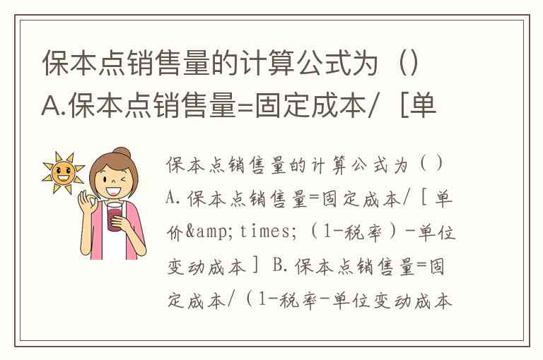 保本点销售量的计算公式为()A.保本点销售量=固定成本/[单价×(1-税率)-单位变动成本] B.保本点销售量=固定成本/(1-税率-单位变动成本) C.保本点销售量=固定成本/(单价-单位变动成本) D.保本点销售量=固定成本/(单价-单位税金)