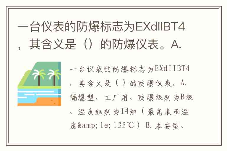 一台仪表的防爆标志为EXdIIBT4,其含义是()的防爆仪表。A.隔爆型、工厂用、防爆级别为B级、温度组别为T4组(最高表面温度≤135℃) B.本安型、工厂用、防爆级别为B级、温度组别为T4组(最高表面温度≤135℃) C.隔爆型、煤矿井下用、防爆级别为B级、温度组别为T4组(最高表面温度≤135℃) D.隔爆型、工厂用、温度级别为B级、防爆组别为T4组(最高表面温度≤135℃)