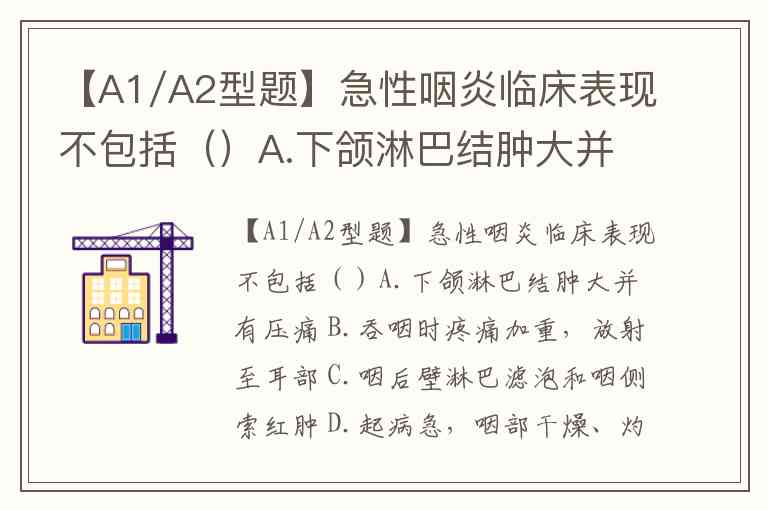 【A1/A2型题】急性咽炎临床表现不包括()A.下颌淋巴结肿大并有压痛 B.吞咽时疼痛加重,放射至耳部 C.咽后壁淋巴滤泡和咽侧索红肿 D.起病急,咽部干燥、灼热、疼痛 E.扁桃体明显肿大,表面可见滤泡