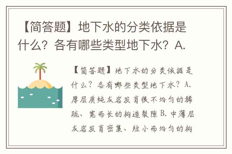 【简答题】地下水的分类依据是什么?各有哪些类型地下水?A.厚层质纯灰岩发育很不均匀的稀疏、宽而长的构造裂隙 B.中薄层灰岩发育密集、短小而均匀的构造裂隙,岩溶发育均匀而强烈 C.泥质灰岩形成的裂隙张开宽度比较小,延伸性也比较差,不利于岩溶的发育 D.厚层质纯灰岩有利于形成大型岩溶洞穴,但岩溶发育极不均匀