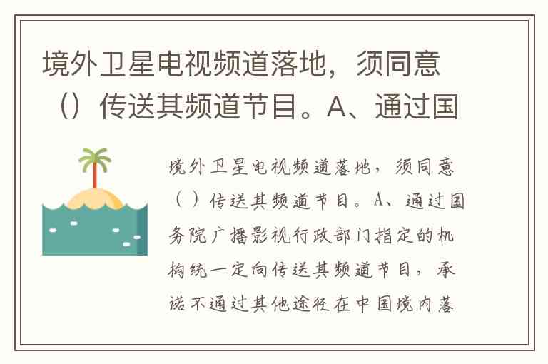 境外卫星电视频道落地,须同意()传送其频道节目。A、通过国务院广播影视行政部门指定的机构统一定向传送其频道节目,承诺不通过其他途径在中国境内落地 B、自己 C、自己委托中国公司 D、自己委托中国的电视节目制作公司