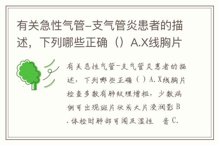 有关急性气管-支气管炎患者的描述,下列哪些正确()A.X线胸片检查多数有肺纹理增粗,少数病例可出现斑片状或大片浸润影 B.体检时肺部可闻及湿性啰音 C.若采用抗菌药物治疗,一般首选青霉素类、大环内酯类、氟喹诺酮类,必要时可选用一代头孢菌素 D.多数预后良好,少数可发展为慢性支气管炎 E.多数有血白细胞升高和分类改变