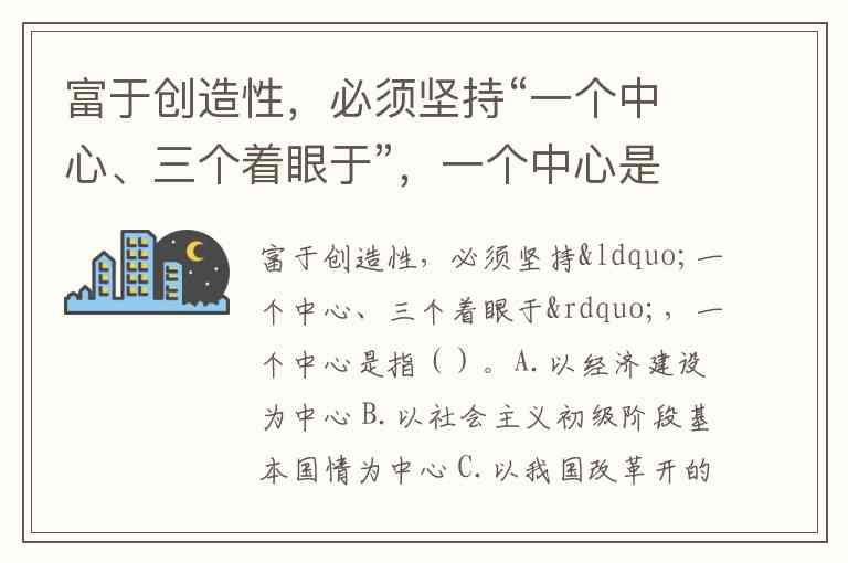 富于创造性,必须坚持“一个中心、三个着眼于”,一个中心是指()。A.以经济建设为中心 B.以社会主义初级阶段基本国情为中心 C.以我国改革开的和现代化建设的实际问题、以我们正在做的事情为中心 D.以马克思主义为中心