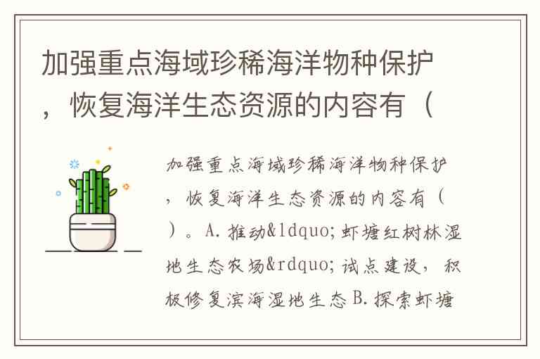 加强重点海域珍稀海洋物种保护,恢复海洋生态资源的内容有()。A.推动“虾塘红树林湿地生态农场”试点建设,积极修复滨海湿地生态 B.探索虾塘养殖产业选型升级和资源综合循环利用的新模式、新途径 C.开展广西北部湾赤潮快速监测、预警及消除关键技术 D.研发与示范、北部湾珍稀生态系统与生物多样性保护研究与示范