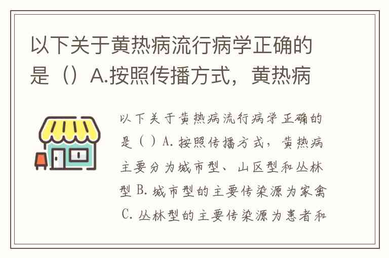 以下关于黄热病流行病学正确的是()A.按照传播方式,黄热病主要分为城市型、山区型和丛林型 B.城市型的主要传染源为家禽 C.丛林型的主要传染源为患者和隐性感染者 D.受感染的蚊可终生携带病毒,并可经卵传代