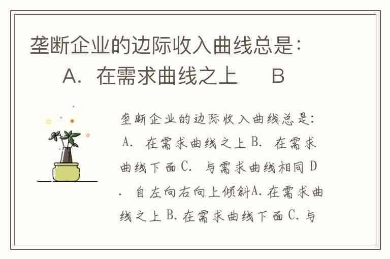 垄断企业的边际收入曲线总是: A.在需求曲线之上 B.在需求曲线下面 C.与需求曲线相同 D.自左向右向上倾斜A.在需求曲线之上 B.在需求曲线下面 C.与需求曲线相同