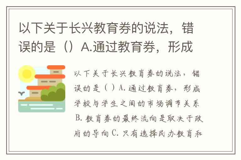 以下关于长兴教育券的说法,错误的是()A.通过教育券,形成学校与学生之间的市场调节关系 B.教育券的最终流向是取决于政府的导向 C.只有选择民办教育和职业学校的学生才可以获得教育券 D.教育经费的主体以政府拨款的形式流向公立学校