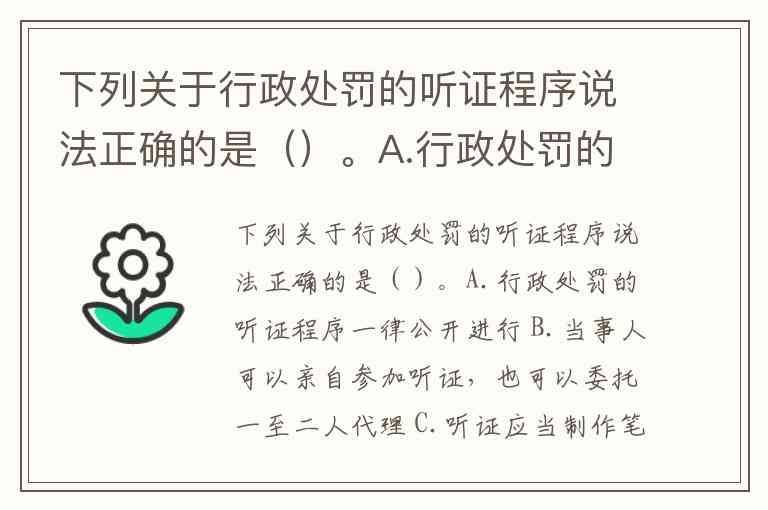 行政处罚听证程序是保障当事人合法权益的重要制度,其核心在于通过公开、质证的方式确保处罚决定的公正性。根据《中华人民共和国行政处罚法》及多地实施办法,以下关于听证程序的说法中,正确的选项为 B、C、D,具体分析如下: