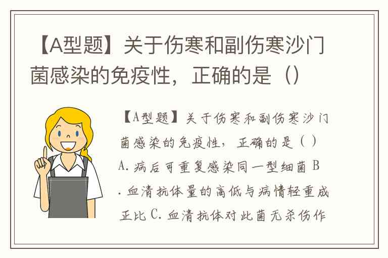 【A型题】关于伤寒和副伤寒沙门菌感染的免疫性,正确的是()A.病后可重复感染同一型细菌 B.血清抗体量的高低与病情轻重成正比 C.血清抗体对此菌无杀伤作用 D.因体液免疫而获得较牢固免疫力 E.因细胞免疫而获得较牢固免疫力