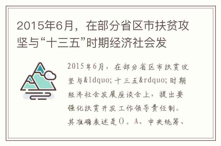 2015年6月,在部分省区市扶贫攻坚与“十三五”时期经济社会发展座谈会上,提出要强化扶贫开发工作领导责任制。其准确表述是()。A、中央统筹、省负总责、市(地)县抓落实 B、中央统筹、东西协作、精准扶贫脱贫 C、中央统筹、省负总责、市县抓落实 D、中央统筹、东西协作、精准滴灌