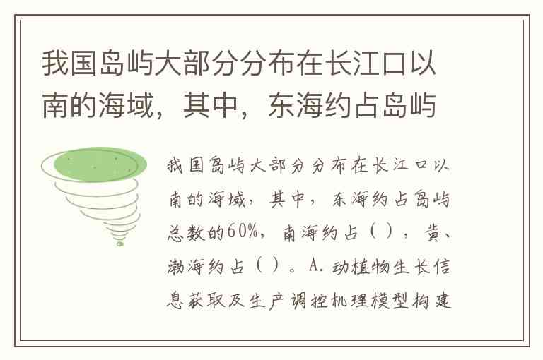 我国岛屿大部分分布在长江口以南的海域,其中,东海约占岛屿总数的60%,南海约占(),黄、渤海约占()。A.动植物生长信息获取及生产调控机理模型构建 B.农业区块链大规模组网、链上链下数据协同技术 C.高品质、高精度、高可靠、低功耗农业专用传感器 D.适应性强、性价比高、智能决策的新一代农业机器人