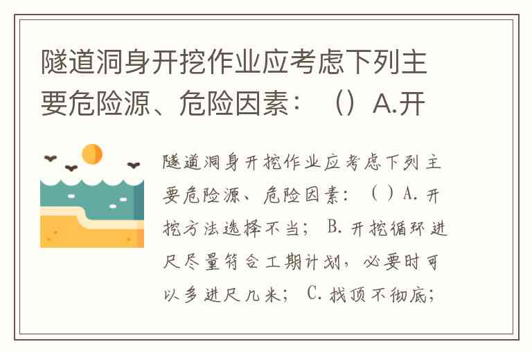 隧道洞身开挖作业的核心风险集中在施工方法不当、支护不及时、现场管理疏漏和爆破违规操作等方面。根据行业规范和事故案例分析,正确答案为 A、C、D、E,而选项B中“尽量符合工期计划,必要时可以多进尺几米”的表述存在严重安全隐患,属于错误做法。