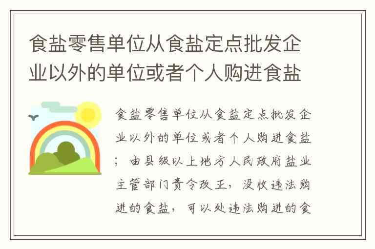 根据《食盐专营办法》第二十八条规定,食盐零售单位若从食盐定点批发企业以外的单位或个人购进食盐,将由县级以上地方人民政府盐业主管部门责令改正,没收违法购进的食盐,可处违法购进食盐货值金额3倍以下的罚款。这一处罚标准在多地政府发布的风险告知书中均有明确,例如郑州市和玉溪市的相关文件均援引此条款,强调对违规购进行为的监管力度。