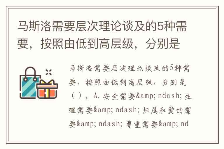马斯洛需要层次理论谈及的5种需要,按照由低到高层级,分别是()。A.安全需要–生理需要–归属和爱的需要–尊重需要–自我实现的需要 B.生理需要–安全需要–尊重需要–归属和爱的需要–自我实现的需要 C.生理需要–安全需要–归属和爱的需要–尊重需要–自我实现的需要 D.生理需要–安全需要–归属和爱的需要–自我实现的需要–尊重需要