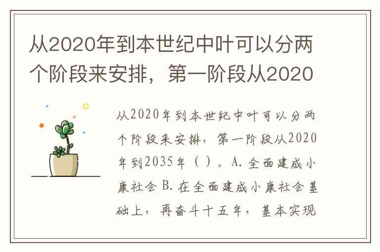 从2020年到本世纪中叶可以分两个阶段来安排,第一阶段从2020年到2035年()。A.全面建成小康社会 B.在全面建成小康社会基础上,再奋斗十五年,基本实现社会主义现代化 C.社会主义现代化建设 D.两个一百年