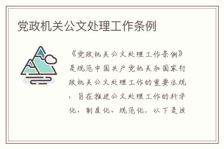 《党政机关公文处理工作条例》是规范中国共产党机关和国家行政机关公文处理工作的重要法规,旨在推进公文处理工作的科学化、制度化、规范化。以下是该条例的核心内容梳理: