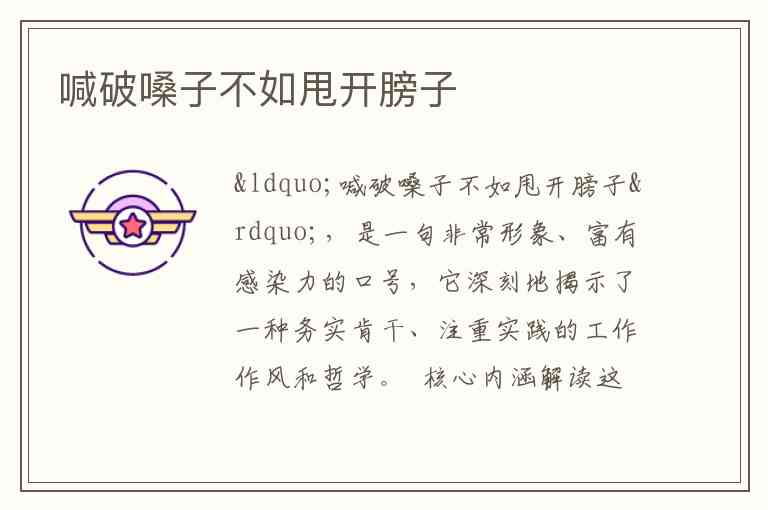 “喊破嗓子不如甩开膀子”,是一句非常形象、富有感染力的口号,它深刻地揭示了一种务实肯干、注重实践的工作作风和哲学。