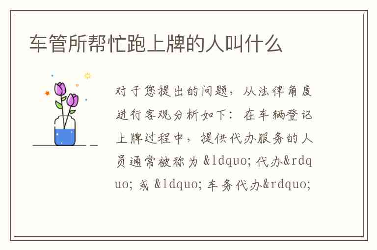 在车辆登记上牌过程中,提供代办服务的人员通常被称为 “代办”或 “车务代办” 。这类服务本身在法律上并非被禁止,但其合法性及伦理边界取决于具体行为方式。