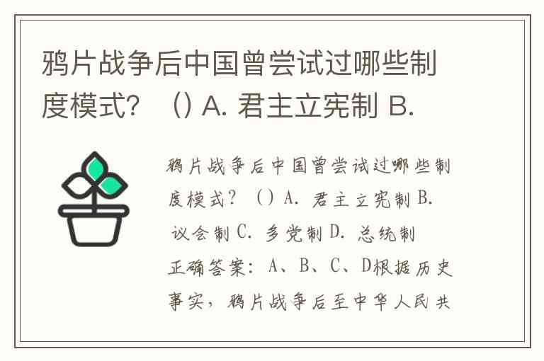 A. 君主立宪制:这主要是清末“新政”和“预备立宪”时期(20世纪初)试图推行的模式,以挽救清王朝的统治。虽然最终失败(如“皇族内阁”的出台暴露了其虚伪性),但它是一次重要的制度尝试。