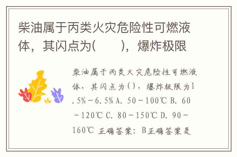 因此,结合火灾危险性分类标准和柴油的实际理化性质,柴油的闪点范围为60~120℃,对应选项 B。