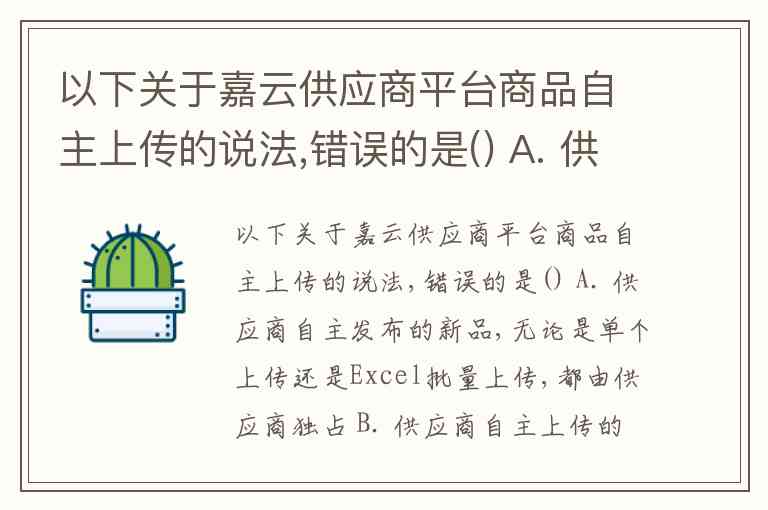 以下关于嘉云供应商平台商品自主上传的说法,错误的是() A. 供应商自主发布的新品,无论是单个上传还是Excel批量上传,都由供应商独占 B. 供应商自主上传的商品,如果一旦缺货,就会被别的供应商匹配 C. 供应商上传商品时,图片不能出现SKU没有的颜色 D. 供应商自主上传商品时,如果价格过高,将会被审核拒绝 正确答案:B