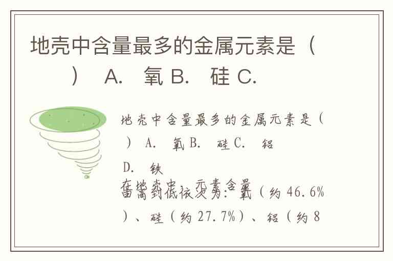 在地壳中,元素含量由高到低依次为:氧(约 46.6%)、硅(约 27.7%)、铝(约 8.1%)、铁(约 5.0%)等。