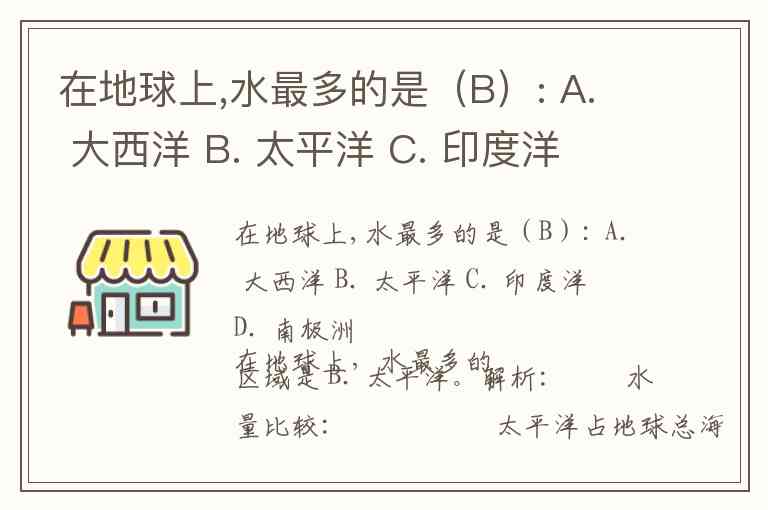 在地球上,水最多的是(B): A. 大西洋 B. 太平洋 C. 印度洋 D. 南极洲