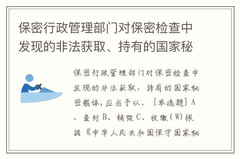 保密行政管理部门对保密检查中发现的非法获取、持有的国家秘密载体,应当予以。 [单选题] A、查封 B、销毁 C、收缴( W)